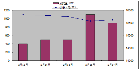 2月13日至2月17日,上海现货市场1#铅整体成交有所好转,开始有所活跃。周一沪铅受上周五伦铅走低影响,早盘低开;现货市场上也跟跌,河南不含税报14500,上海不含税品牌铅如金沙、水口山等14700,含税的贴水幅度有所下降,跌至150,报价多在15900。市场上观望气氛明显较浓,下游不愿大肆采购。周二询价有所增多,价格也多数小幅度下滑50,云南铅和沈阳铅报15700-15750,不含税也跌50,成交略有扩大。周三询价更显积极,但成交好转不是很明显,成源和个旧铅较多见。周四随着现货市场价格的大幅下挫,下游企业和贸易商都积极询价成交,品牌铅较多见,而个旧铅等货源并不是很充足。周五市场成交有所变冷淡,普通铅和品牌铅都不少,但下游之前采购较充分,因此实际成交有限。