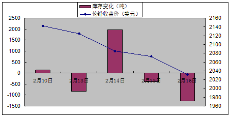 2月13日至2月17日,伦铅直线下挫,但有止稳迹象,本周伦铅最高价2170美元,最低价2002美元。