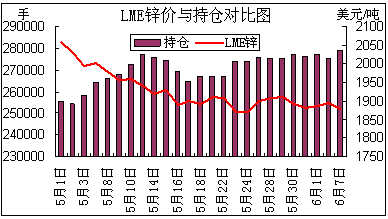 随后投资者对欧债问题的忧虑缓和,沪期锌低位反抽,开始上行,但上行力度比较弱,伦锌走势相对稍好些,盘中一度上穿1900,中国意外降息,一度让伦锌 触摸至1915。然伯南克讲话没有提供更多货币刺激措施的暗示,QE3或落空,两市期锌再次下滑。持仓量上,本周伦锌开盘仅三天,持仓量变化不是太明显, 沪期锌持仓量总体呈现下滑趋势,暗示商家目前表现谨慎,获利了结意愿强。