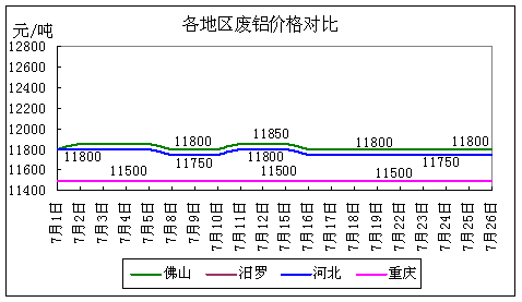 重庆地区:本周西南地区废铝价格持稳,截止周五市场报价为:机生铝11400-11600元/吨,铝合金12000-12200元/吨,与上周持平。目前市场成交清淡,天气炎热也是一主要因素, 商