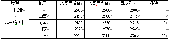 本周国内各地市场氧化铝价格维持整体偏弱走势。其中山西地区,报价区间保持不变,仍维持在2450-2500元/吨之间,交投情况依然清淡。而河南地区,本周市场报价继续呈小幅下探态势,大厂最高报价小跌10元/吨至2550元/吨左右,成交下限位置则维持在2480元/吨一线,成交相对偏淡。山东地区,本周市场报价继续维稳,主流报价区间在2520-2570元/吨之间,交投情况相对一般。华南地区,本周市场报价则延续小幅下跌态势,目前最低报价已降至2230元/吨一线,交投情况依然极为低迷;而中铝厂家报价则仍维持在2900元/吨不变。本周国内电解铝价格转为震荡走势,而氧化铝价格也略显平稳;但因大趋势依然欠佳,加之,下游需求看不到有任何即将改善的迹象;所以我们预计后市氧化铝走势或仍将维持整体偏弱格局,建议用货商维持按需采购即可。