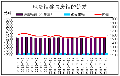 本周沪铝走势平稳,现货价格有小幅上涨。截至目前,佛山铝锭不带票价格在14000-14100元/吨,较上周上涨30元/吨,破碎生铝价格12350-12550元左右,较前一交易日上涨50元/吨。本周工信部发布制定成稿的《铝行业规范条件》,明确提出遏制铝行业重复建设,化解电解铝产能过剩矛盾,此举长期来讲利好整个铝行业,不过随着西部电解铝权重将扩大,将会拉低电解铝成本,对铝价也形成一定利空。料短期内沪铝依旧以小幅震荡为主。目前现货铝锭和废铝的价差保持在1550元/吨左右,走势趋稳。本周现货铝锭和废铝价格变化较小,整体来讲,其价格仍处在低位震荡,而近期出现重大利好或利空消息较小,料其价差短期内依旧变化不会太大,对废铝来讲,利好并不是很明显。